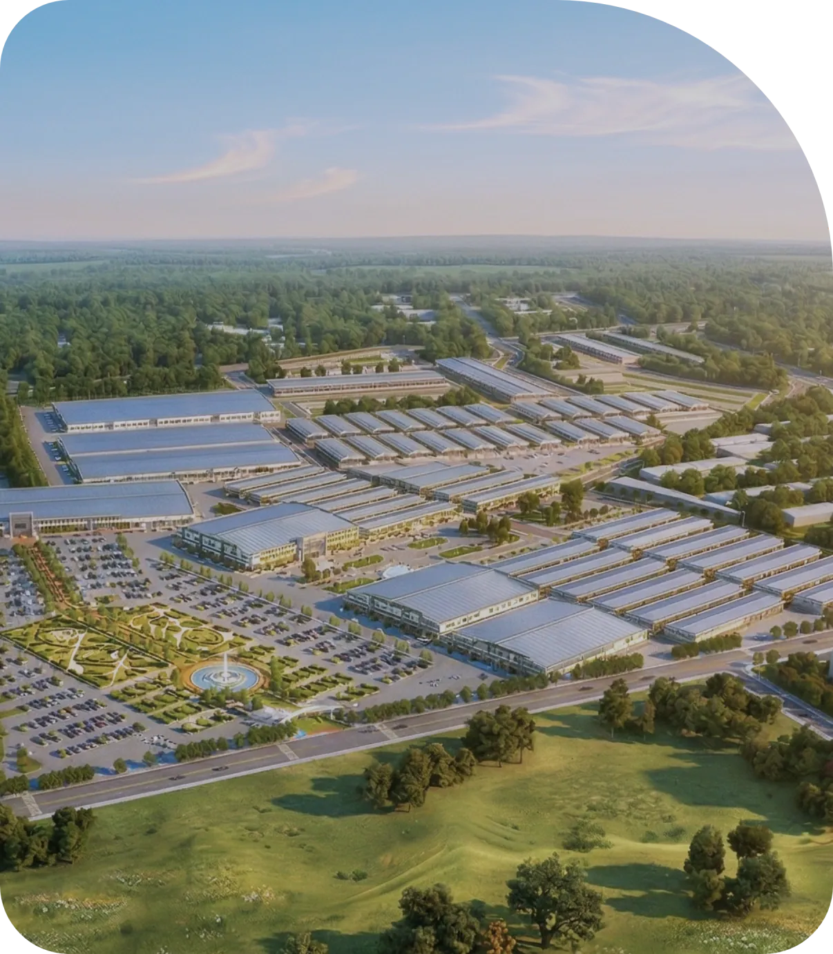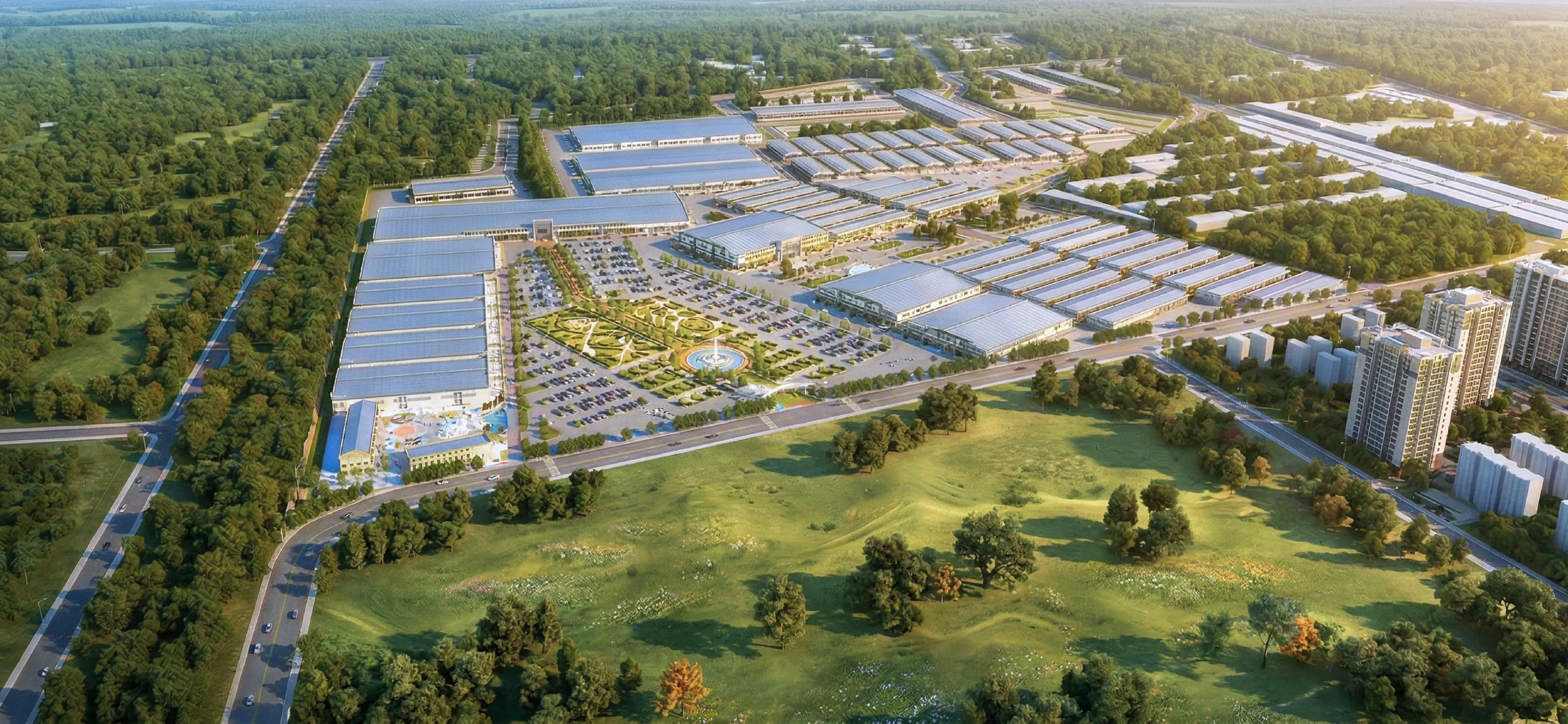 园区规划占地面积约 88 万平方米,总建筑面积约 35 万平方米。园区集加工生产、商业展示、批发贸易、企业办公、仓储物流及商业配套服务于一体,为企业提供完善的商业运营环境。